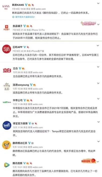 吴亦凡事件网络快速发酵于7月18日,当日晚间,嗅到不一样“味道”的多个品牌随即宣布与吴亦凡终止合作。