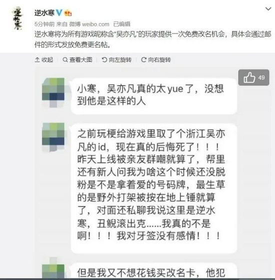 逆水寒为游戏ID包含吴亦凡的玩家提供改名机会。