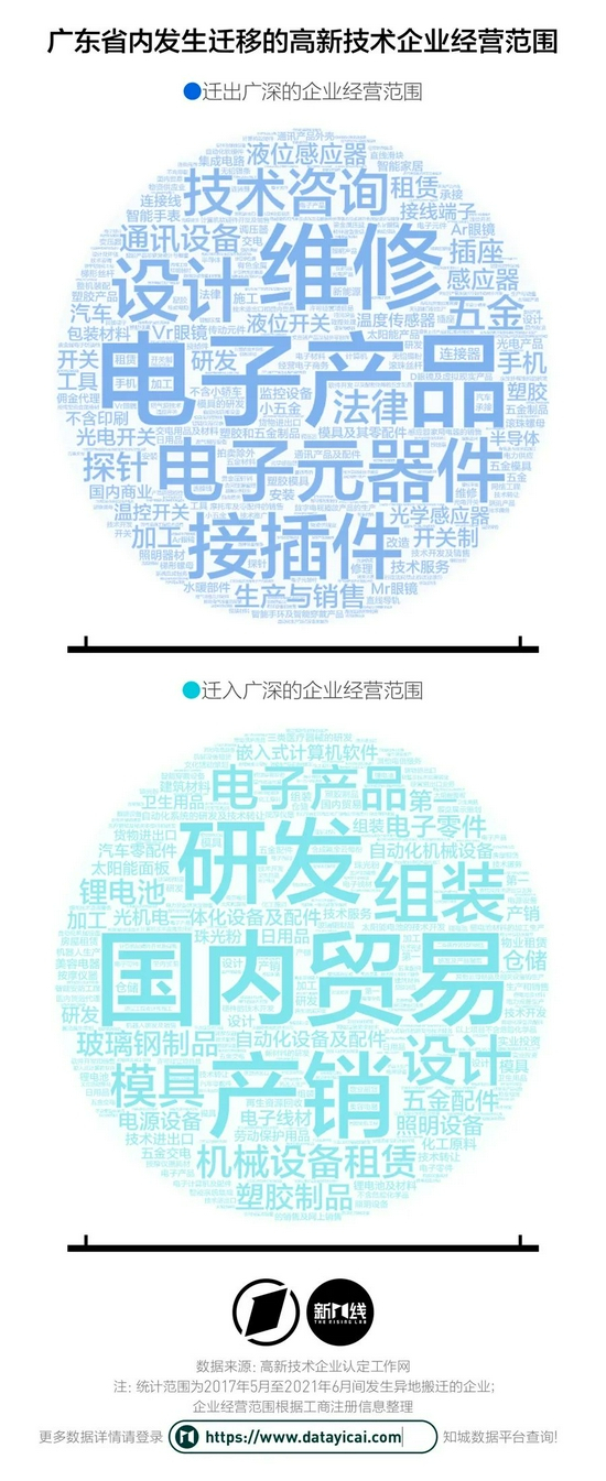 迁出广深的十余家企业中,以电子元器件的生产制造为主,它们选择迁往惠州、韶关、河源、汕尾、中山、肇庆这些周边城市,那里拥有更富余的土地和更优惠的地价。而迁入广深的企业大部分都来自东莞,它们主要经营软硬件的研发、设计和销售。