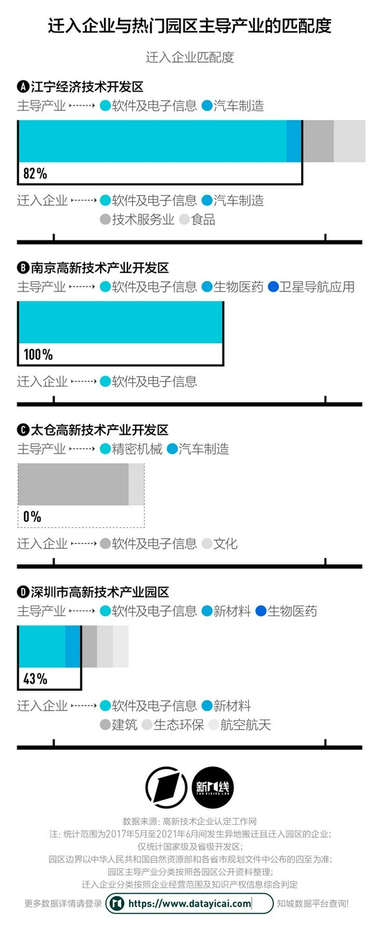 新一酱将迁入高新技术企业最多的园区,与迁入企业的所属行业作了产业相关度的匹配。其中,江宁经开区、南京高新区、深圳高新区均与迁入企业之间显示出了较高的适配度。而太仓高新区的迁入企业与其主导的精密机械、汽车制造并不相关。