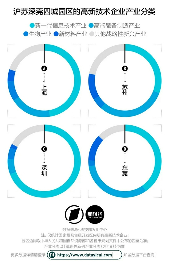 与这两座核心城市相比,苏州与东莞在高端装备制造和新材料等领域的企业占比更高,产业结构上明显拉开了差距。