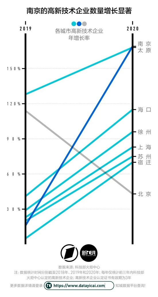 从数据上来看,政策确实起到了效果。异地搬迁事件大多发生在2020年,在这一年里,南京的高新技术企业的年增长率从16%猛增至169%。