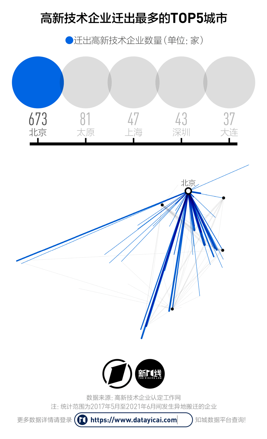 地图上的线条越粗意味着迁出的高新技术企业数量越多。北京以迁出673家的数字排在第一位,比排名第二的太原高出八倍。上海、深圳等一线城市也在迁出名单的前列。