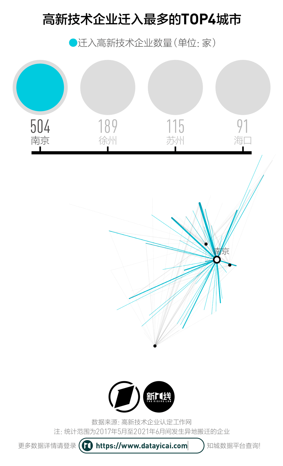 从城市层面来统计,北京至南京是最活跃的一条搬迁路径。所有从北京迁出的高新技术企业中,有52%的企业选择了南京。
