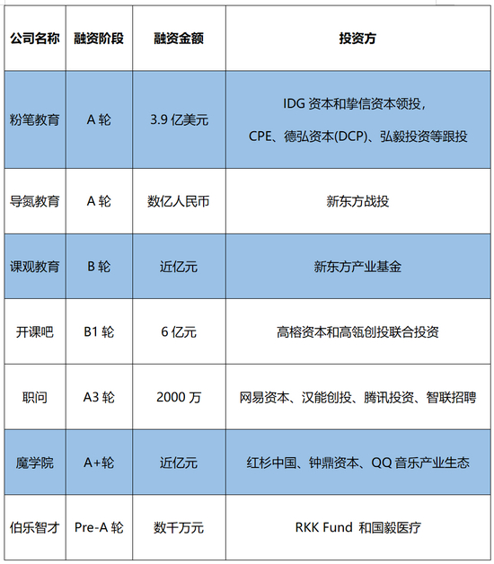 开课吧宣布融资同一天,在线职业教育平台职问宣布,已于2021年一季度完成共2000万元人民币的A3轮融资。7月13日,企业培训SaaS平台魔学院宣布完成近亿元A+轮融资,由红杉中国领投,钟鼎资本跟投。此前魔学院曾于2月完成QQ音乐产业生态的数千万元融资。