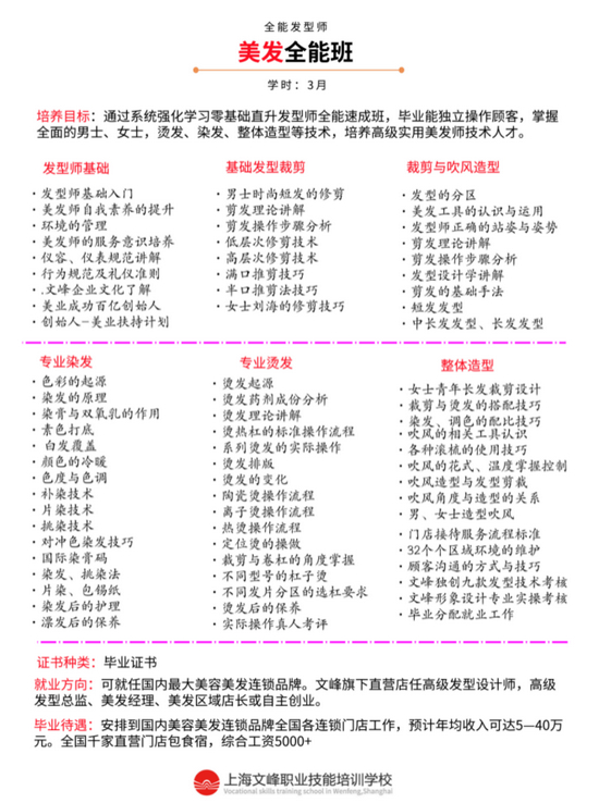 巧合的是,小巴从连锁美发品牌文峰,获得了一张3个月的美发培训介绍单,学费价格是5950元。其中介绍了六大项技能,包括发型师基本素质、基础发型裁剪、裁剪与吹风造型、专业染发、专业烫发、整体造型。毕业待遇一栏写着:预计年收入5万—40万;包食宿,综合工资5000+。
