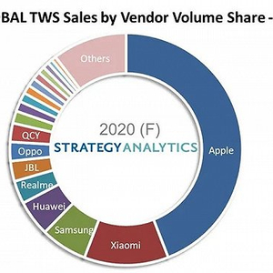 Strategy Analytics按供应商数量份额划分的全球TWS销售额