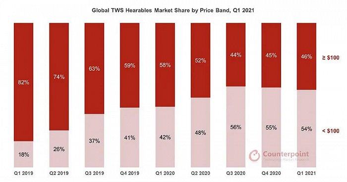Counterpoint Research 2021年第一季度按价格区间划分的全球TWS耳戴式设备市场份额