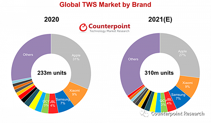 其中,苹果的TWS耳机市场占有率将从2020年的31%,预计下滑到2021年的27%。而在2019年,苹果的这一份额占比高达54.4%。