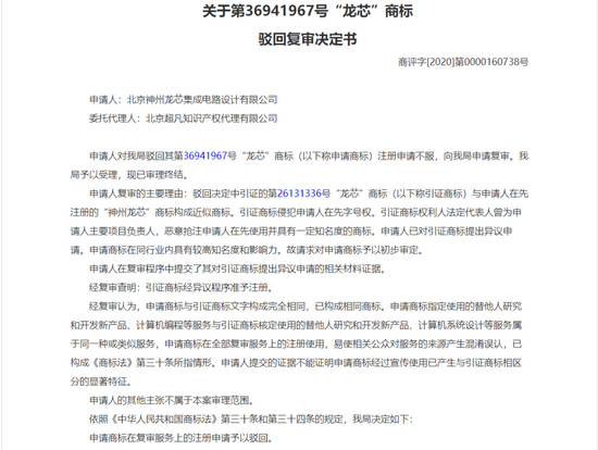 而神州龙芯则于2019年3月19日提出“龙芯”商标申请。不过上述申请被国家知识产权总局商标局商评委连续驳回,根据2020年6月披露的《关于第36941967号“龙芯”商标驳回复审决定书》,神州龙芯认为龙芯中科申请的第26131336号“龙芯”商标与申请人在先注册的“神州龙芯”构成近似商标,且龙芯中科法定代表人(即胡伟武)为公司主要项目负责人。因此龙芯中科存在恶意抢注申请人在先使用并具有一定知名度的商标。据此,神州龙芯对龙芯中科申请注册“龙芯”提出异议申请。