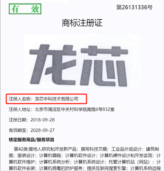 值得一提的是,目前“龙芯”商标归龙芯中科所有,商标申请/注册号为第26131336号。2017年8月30日龙芯中科提出申请,并于2020年4月21日注册公告,专用权期限为2018年9月28日至2028年9月27日。