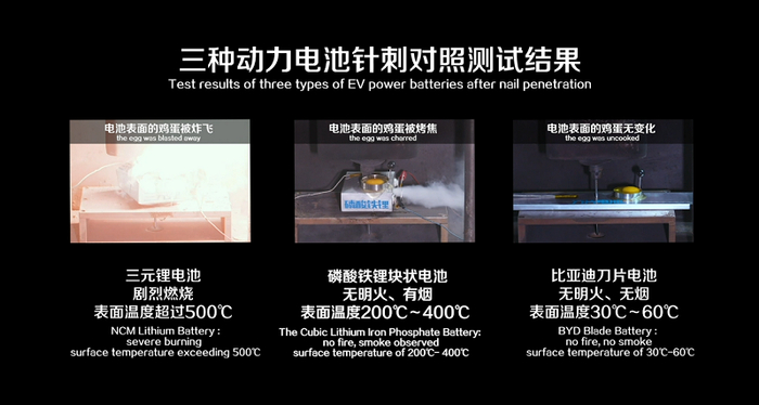 针刺测试的结果对比明显,比亚迪刀片电池针刺后,无明火、无烟,表面温度仅为30-60℃。普通磷酸铁锂电池针刺后,无明火,冒烟,表面温度200℃-400℃。三元锂电池针刺后,剧烈燃烧,表面温度超过500℃。