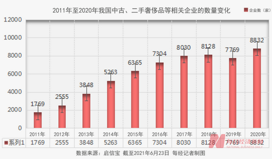 启信宝数据显示,我国以中古/二手奢侈品/中古箱包/奢侈品回收、寄卖为关键词的企业,在2020年新增1912家,新增数量创十年来最高。火热势头延续到了2021年,仅半年时间就新增1211家。截至8月3日,我国中古相关企业已达9758家。
