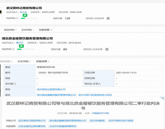 第二,通过天眼查相关信息发现,在自身风险信息上,蔡林记和蔡明纬两家公司自身风险信息分别多达98条、68条。这其中还包括两家公司之间因为商标权纠纷的多起诉讼案件。