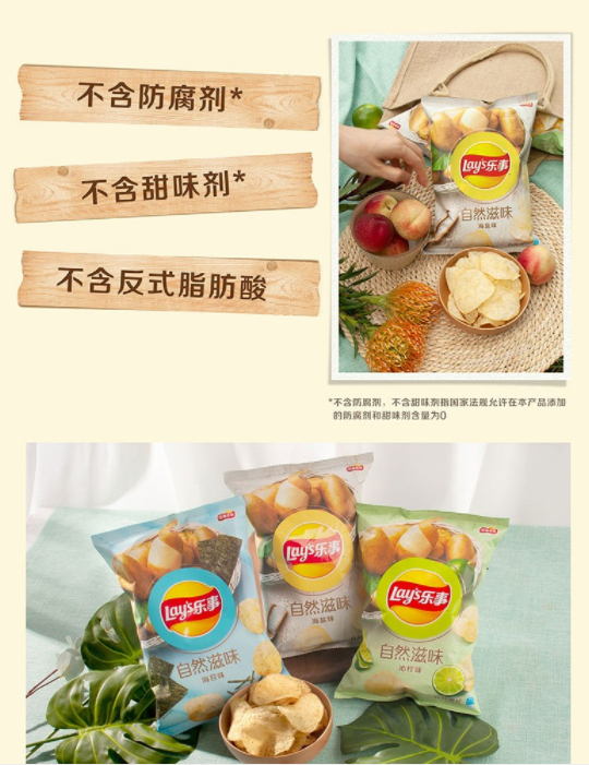 乐事推出的“自然滋味”系列薯片,强调不含防腐剂,不含甜味剂,不含反式脂肪酸,努力让吃薯片这件事变得不那么罪恶。这款产品还在社交平台小红书上,掀起了好评浪潮。