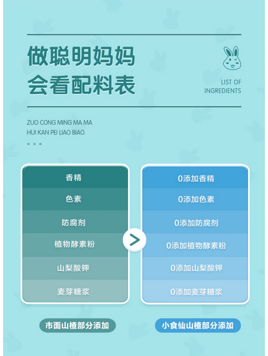 良品铺子旗下“食小仙”品牌专注儿童健康零食打造,他们的产品不仅简化配料表,还不遗余力的“教育”妈妈,如何看懂食物配料表,并再一次突出强调了自家产品配料表的干净简单:有六项添加剂都含量为零。