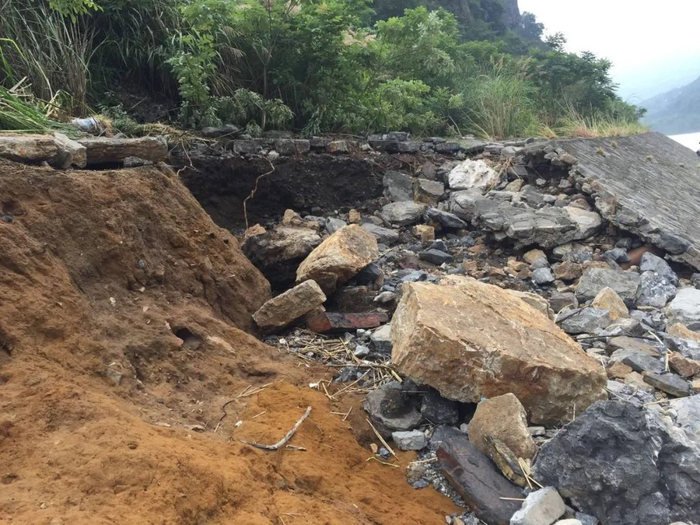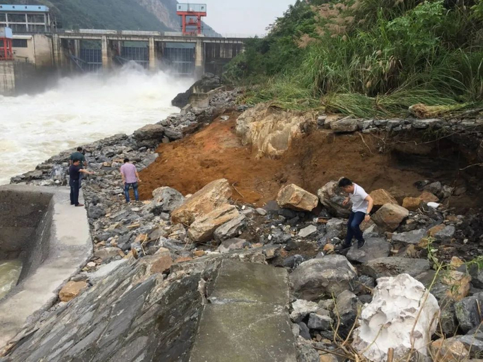 坝下边坡的混凝土墙被冲毁的缺口长达百米