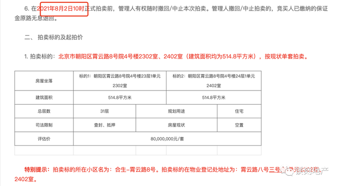 6月10日,霄云路8号两套房产3号楼1单元2402室和8号3号楼1单元2302室即将拍卖的消息公布。两套住宅建筑面积皆为514.8平方米,评估价8000万元,目前房屋在空置,有一定的装修。