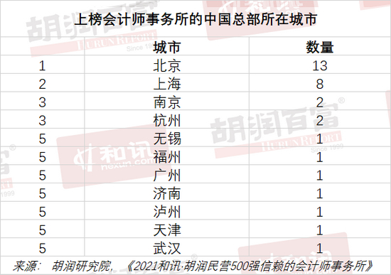 上榜会计师事务所的中国总部集中在北京(13家)和上海(8家),其次是南京和杭州,各2家