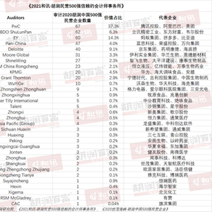 (2021年8月9日,上海)提供有质量的榜单与调研的胡润研究院携手和讯今日联合发布《2021和讯·胡润民营500强信赖的会计师事务所》(Hexun · Hurun Preferred Auditors of China‘s 500 Most Valuable Companies 2021),列出了审计2020胡润中国500强民营企业数量最多的会计师事务所。