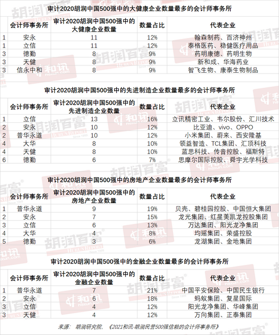 《2021和讯·胡润民营500强信赖的会计师事务所》列出了审计2020胡润中国500强民营企业数量最多的会计师事务所。这些会计师事务所的核心业务是审计,除此之外,他们也提供管理咨询、交易服务、税务服务等专业服务。