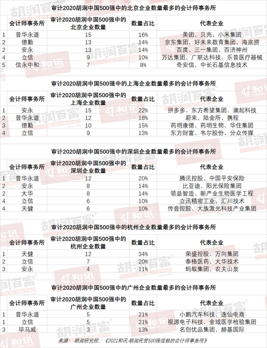 2020胡润中国500强民营企业中,占比最多的北京有93家企业,审计这些北京企业数量最多的是普华永道15家,德勤和安永各13家。