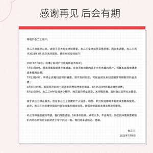 8月1日0时起,客服将开启统一退还会员费通道,8月15日0时将截止操作退费;8月15日0时,衣二三App及相关小程序、网页版均停止运营,关闭服务器,届时及以后将无法登陆。