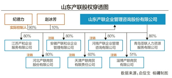 启信宝显示,山东产联企业管理咨询股份有限公司(简称“山东产联”)成立于2014年,法定代表人为纪德峰,山东产联为产联企业集团的主公司,集团实际控制人为纪德力。值得一提的是,纪德力也是劳联集团的法定代表人。