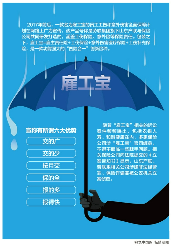 几年前,一款名为“雇工宝”的产品在劳务市场上打响了知名度。该产品号称由劳联集团旗下山东产联与多家保险公司共同研发打造,拥有“交的广、交的少、按月交、保的全、报的多、报得快”多项优势,实则以“团险个做”模式赚取保费、保险金差额。