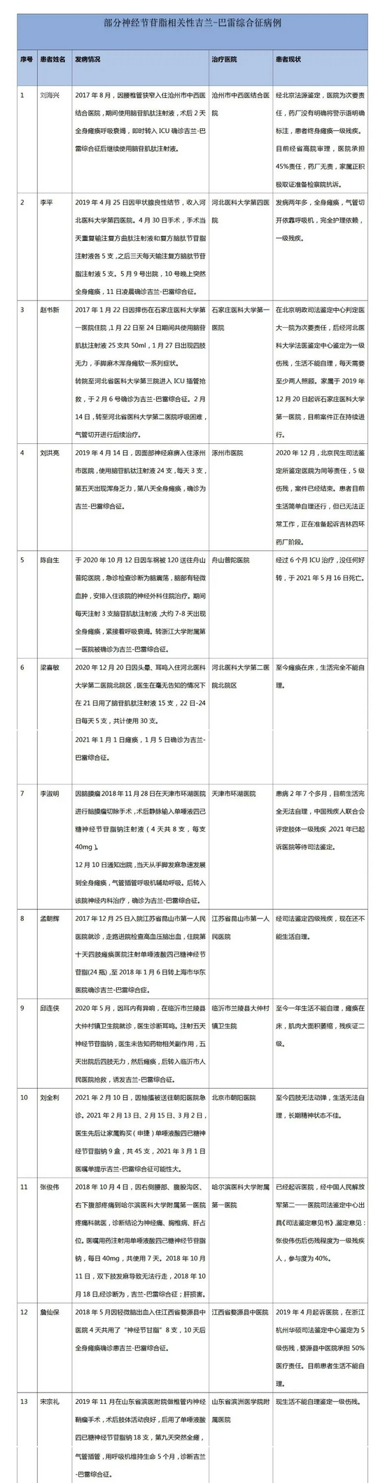 在这些患者中,他们最初去医院看病的原因各不相同,有的因为脑梗,有的因为头晕耳鸣,有的因为做甲状腺结节手术,有的甚至就是不小心摔了一跤……虽然,不是所有使用这类药物的患者都会出现瘫痪,但是一旦被确诊吉兰-巴雷综合征,对一个家庭来说,就是一场无法挽救的灾难。