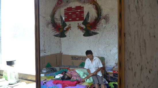 梁秋玉的丈夫正在为她做手部按摩。图/赵牧 摄