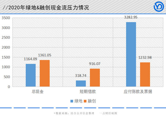 再看看两家公司踩中“三条红线”的情况——融创踩中一条(剔除预收款后资产负债率78.69%、净负债96%、现金短债比1.08),绿地一条不落(剔除预收款后资产负债率84.09%、净负债率139.24%、现金短债比0.79),也算难兄难弟(数据来源:南方产业智库)。
