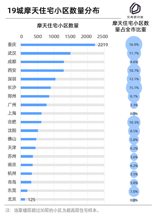 按照贝壳研究院的统计口径,超过30层摩天住宅小区数量,排名首位的重庆超过2219个,占全市住宅小区比重达到16.9%,成为典型的“住在云端”的城市;武汉、成都、西安、深圳等地摩天小区数量均已超过1000个,同样不遑多让。