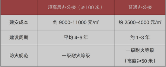 据克而瑞资管调查整理,国内40层以上、高度100米以上的超高层办公楼的建安成本平均约为普通办公楼的3-4倍,建设周期平均约为2-3倍。