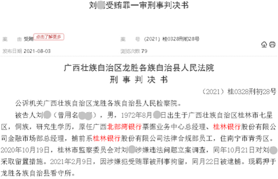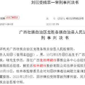 近日,中国裁判文书网披露的一则银行高管受贿案引发关注:广西北部湾银行票据业务中心原总经理、桂林银行金融市场部原总经理刘某,受贿727万余元,被判有期徒刑10年,并处罚金100万元。