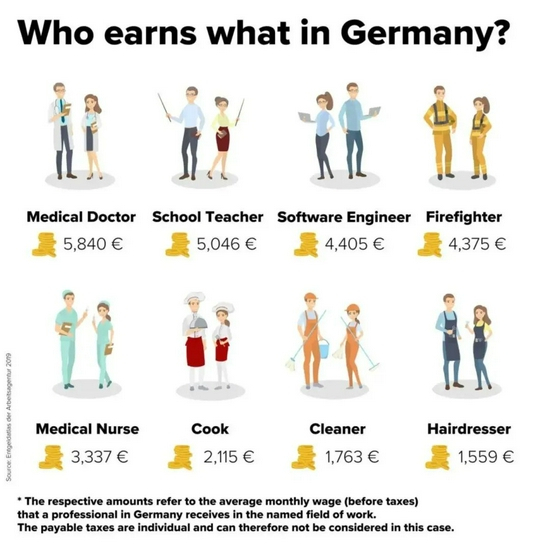 在德国, 一个高级技工跟中层管理者收入差不多. 德国世界500强的某公司电焊工,除掉保险和税收,工资3000多欧元,这在当地就可以过上非常体面的生活。如果租个一百平的房子,大概也只需四五百欧元。