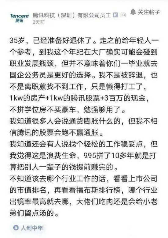 今年年初,一则腾讯35岁员工准备退休的帖子刷了屏。35岁就退休是因为他有三张底牌,1000万的股票+1000万的房产+300万的现金,相对于大部分打工人月薪不足6000的现状,这位仁兄已经秒杀了99%的同龄人,成功实现逆袭。