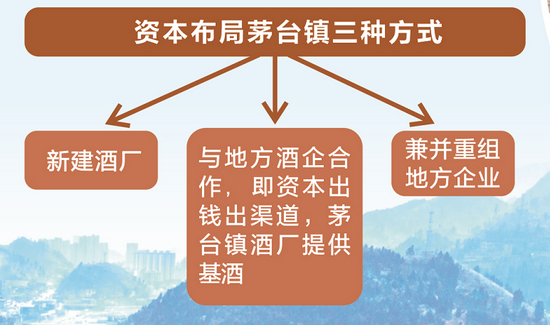 从目前进入茅台镇的资本布局来看,主要方式包括:新建酒厂;与地方酒企合作,即资本出钱出渠道,茅台镇酒厂提供基酒;兼并重组地方企业。
