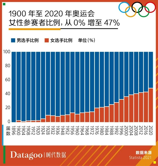 在参赛人数上,2020年东京奥运会中,女性参赛者占比达到了历史最高,47.87%。