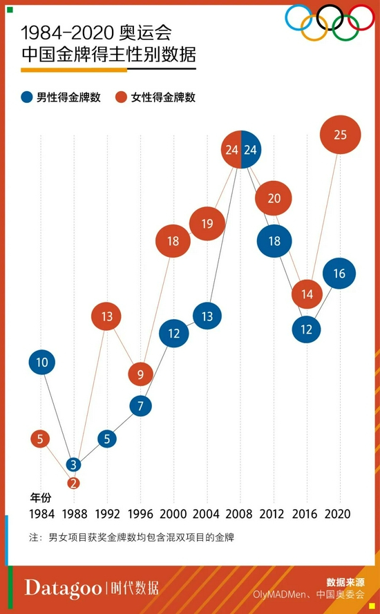 从整体摘金比例上看,在1984年至2020年之间举行的一共10届奥运会中,中国女性奥运选手的表现一直比男性更胜一筹,金牌数连续7届超过男子项目。