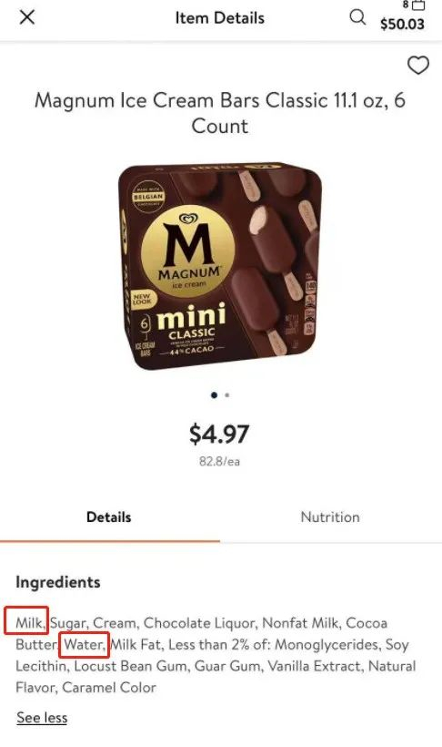 《中国消费者报》记者查阅在中国生产的梦龙冰淇淋配料表发现,使用原料包括饮用水、巧克力、白砂糖、乳粉、植脂、麦芽糊精、乳清粉、食品添加剂等,但没有牛奶或牛乳。其中,乳粉含量仅为3.7%。而在欧美地区生产的梦龙冰淇淋配料表中,排名第一的是生牛乳。