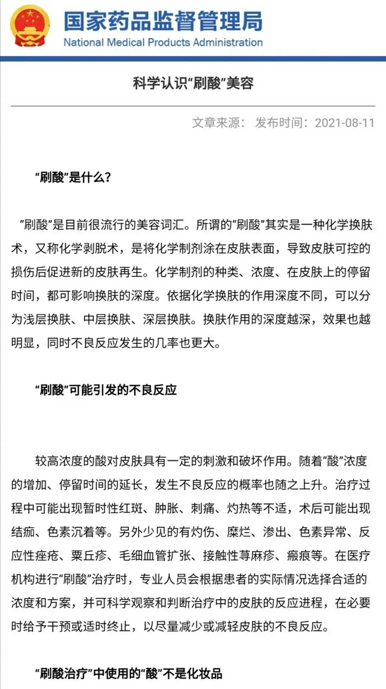 ▲8月11日,国家药监局官网发文,提示公众科学认识刷酸美容。图/国家药品监督管理局官网截图