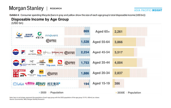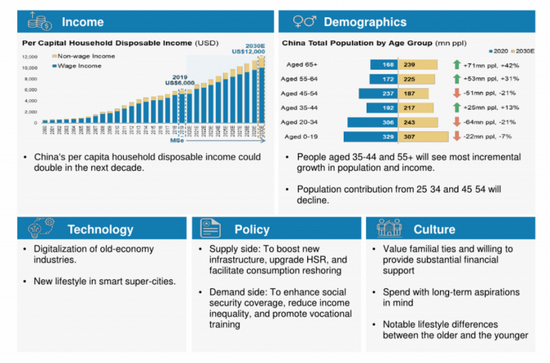 根据摩根士丹利预计,到2030年,中国家庭人均收入将翻一番,而购买力将由35-44岁和55岁以上年龄段(1960年代出生的婴儿潮一代及其子女)主导,此外,到了2030年,消费重点将从现在的“年轻消费者”转向为“家庭需求和退休消费”。