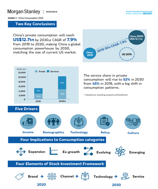 以“情感健康”和“自我实现”为目标的消费将日益突出,消费者将越来越依赖一个“全自动化”的社会。摩根士丹利认为,中国消费者的消费理念将引领全球。