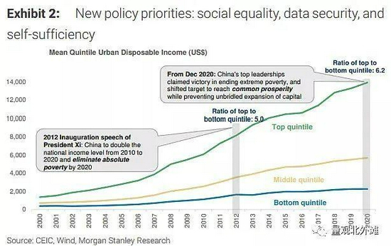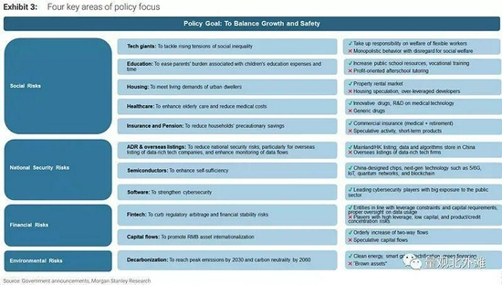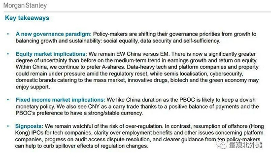 摩根士丹利:我们正站在中国经济和资本市场一个重要的转折点上。新目标带来的经济底层逻辑的重置以对互联网巨头监管为标志,中国正在转换经济发展的底层逻辑:从增速优先转向兼顾公平,对于部分高垄断---进而带来高ROE---行业可能有影响。
