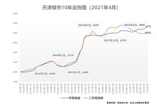 如果,你把第三阶段单独拿出来分析,就会发现天津的二手房业主情绪相当不稳,当房价看好,它涨的比新房还厉害,当房价看跌时候,它跌的比新房也厉害。