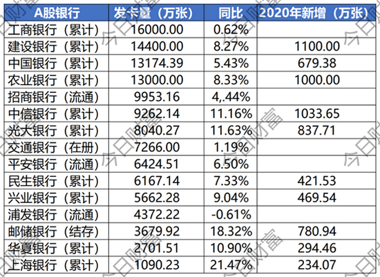 2020年A股银行披露信用卡发卡量前十五名