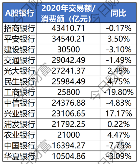 2020年A股银行披露信用卡交易量破万亿元的公司