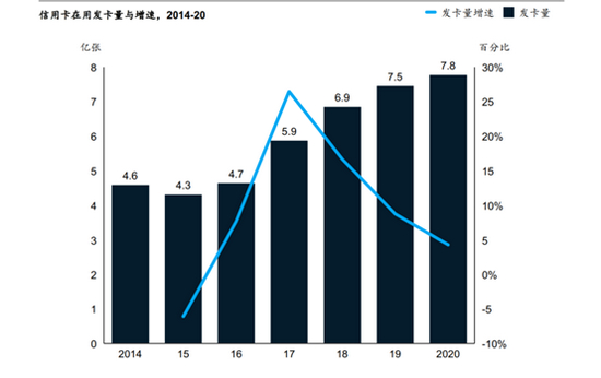 根据央行《2020年支付体系运行总体情况》,2020年在用卡量为7.78亿张,较2019年同比增长4.26%,创下五年来该指标的最低增幅。