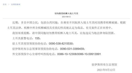 近期,多名中国公民,包括台湾同胞,在乘坐不同航班入境土耳其时因携带槟榔被捕。根据土耳其法律,槟榔中所含槟榔碱因具有致幻性而被认定为毒品。有关案件正在审理中。